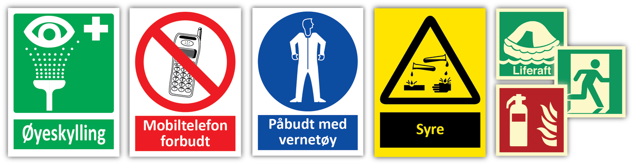 - Kan leveres som selvklebende skilt eller plateskilt